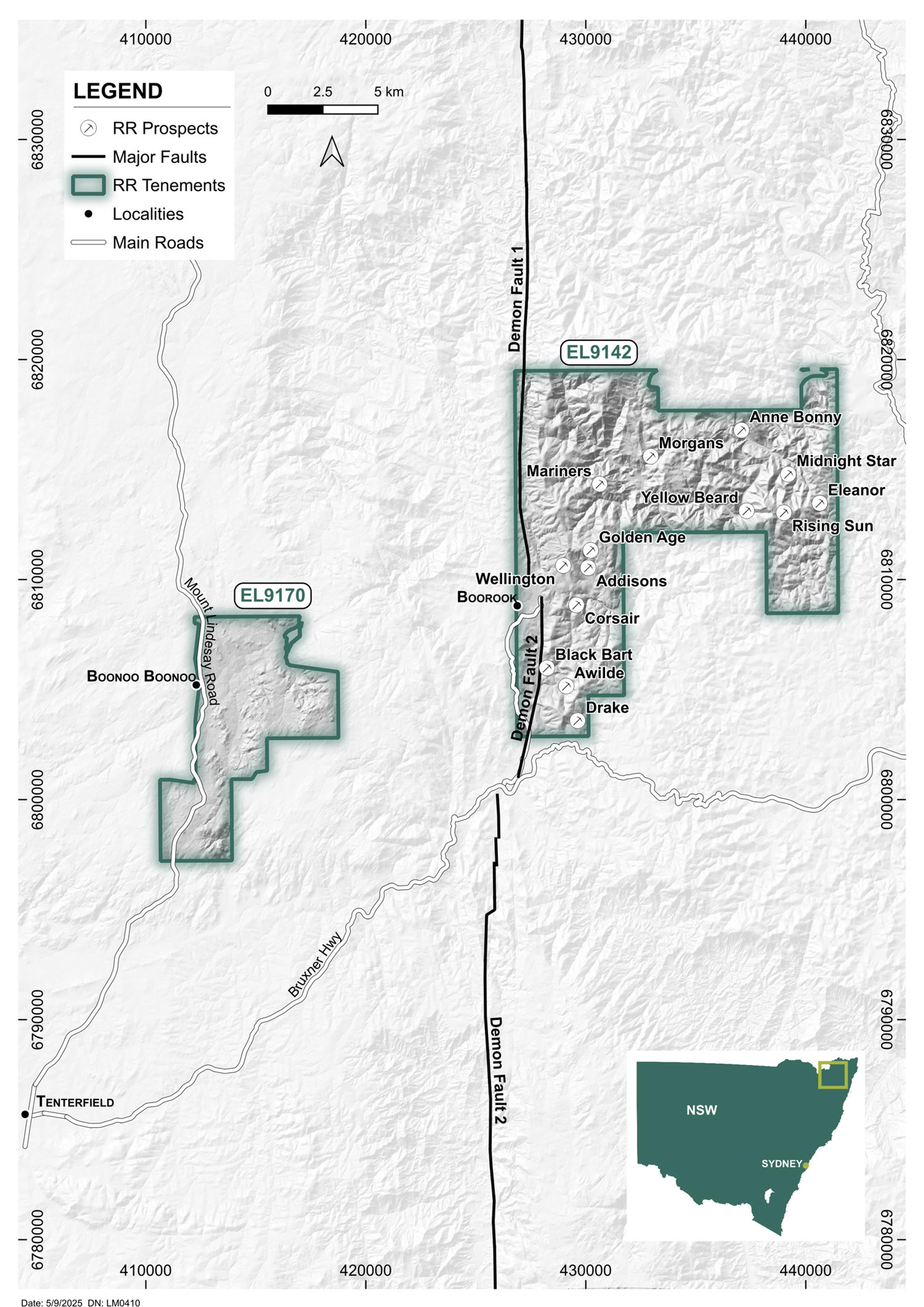 The New England Region is situated in the Northern Tablelands of the northeastern part of NSW, which encompasses two of the Company’s tenements (approximately 198km2). These two tenements fall within the broader New England Orogen, a region known for historic gold, and base metal deposit. The tenements lie within the Clarence-Moreton Basin of the New England Orogen, overlying the prospective 264Ma Drake Volcanics, host to the Mt Carrington gold-silver complex. The Tenements are prospective for high grade lode and low grade stockwork epithermal gold and silver.