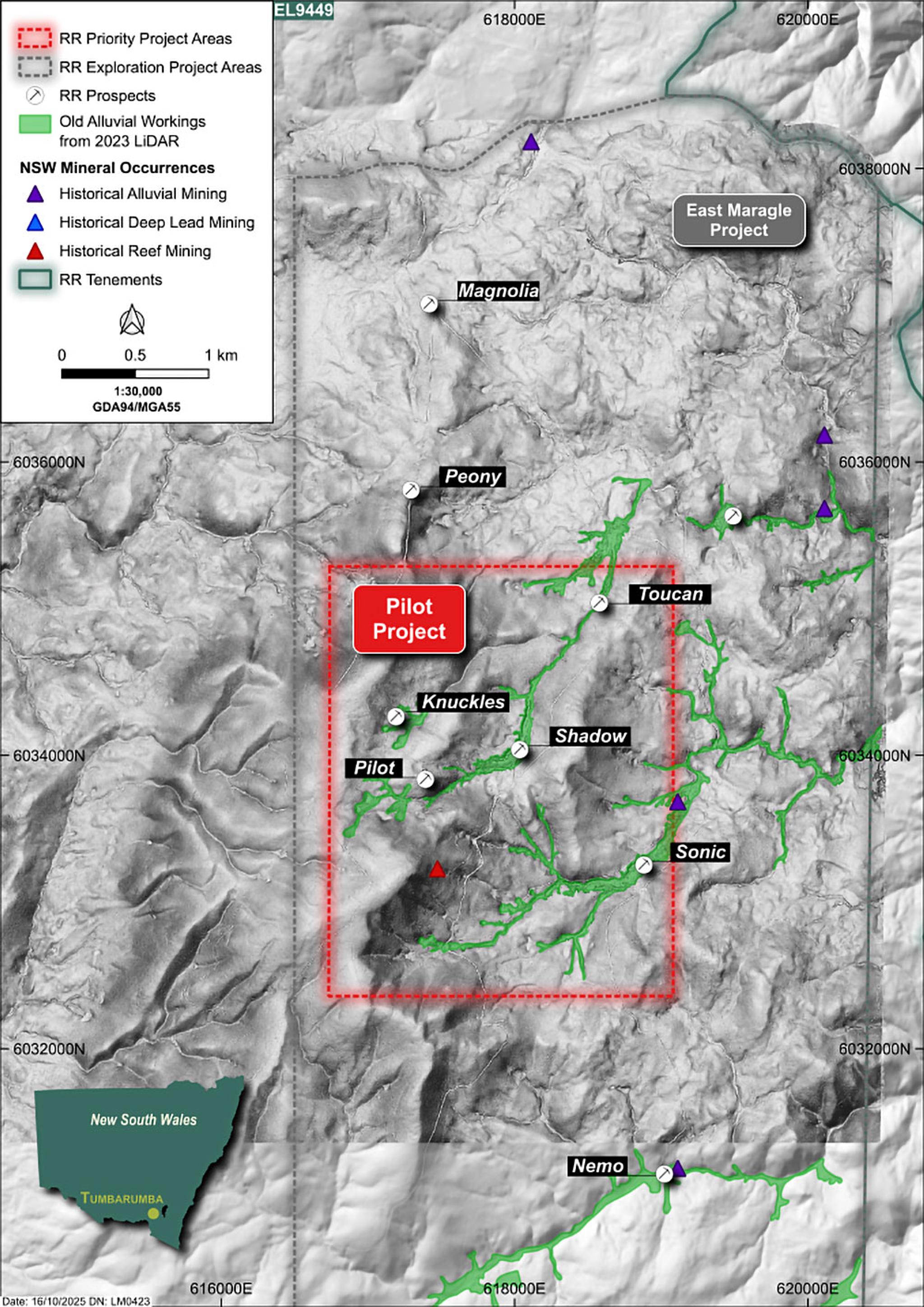 The Pilot Project is the Company’s flagship project, covering 6.96km2 (2.4km x 2.9km) within EL9449, located southeast of the town of Tumbarumba, NSW. The project encompasses five key prospects: Pilot, Knuckles, Shadow, Toucan, and Sonic.